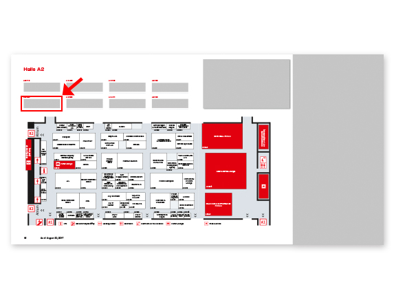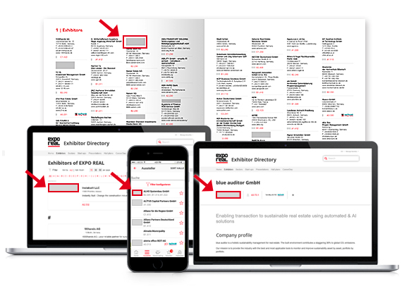 Bei der Buchung eines exklusiven Logos über dem Hallenplan werden Sie im EXPO REAL Guide, im Ausstellerverzeichnis online und auf großformatigen Aushangplänen vor Ort veröffentlicht.