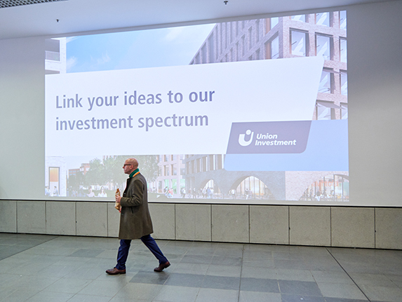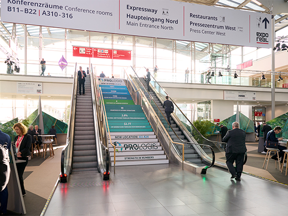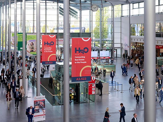 Ob Logo-Lettering, Anzeige oder Film: Nutzen Sie die leuchtstarke LED Wall im Eingang West, damit ist Ihr Unternehmen genau dort präsent, wo das Fachpublikum verweilt. Machen Sie mit einem 15-sekündigen Einspieler die Finanz- und Immobilienwelt auf sich und Ihr Unternehmen aufmerksam!
