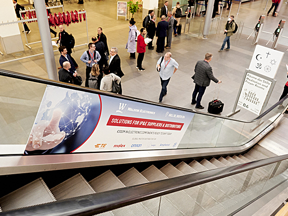 As big as a movie screen: impressive megaposters guide participants from the entrance directly to your booth. These oversized attention-getters ensure that you “control the airspace” inside the busy Entrance West i.e. directly next to the registration counters.