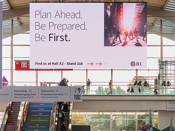 Whether you would like to use it for logo display, advertisements or a video: Take advantage of our highluminosity LED wall in the West Entrance, so that your company is present exactly where the trade audience is. Capture the attention of the financial and real estate sector with a 15-second clip to highlight your business!